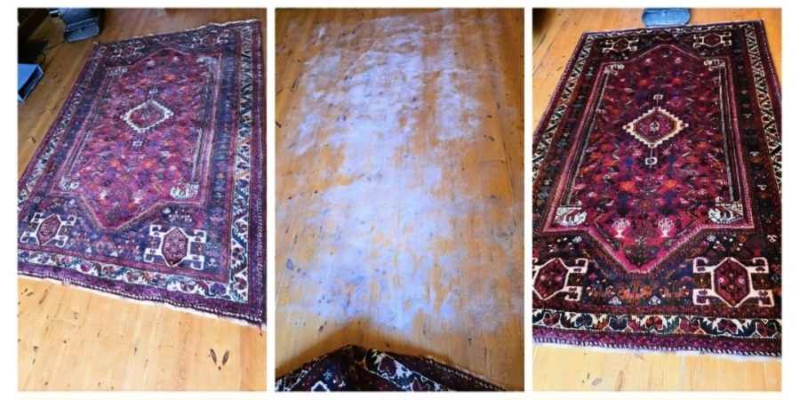 Many oriental rugs arrive in our rug cleaning workshop in a tired state. Full of dry sandy soil, matted pile, colours flat and subdued. Oriental rugs and runners are very often placed in very high traffic areas, quickly collecting ground in dirt and dust. This persian rug collected from Colyton Raleigh between Budleigh Salterton and Sidmouth really was in a sorry state, requiring specialist vacuuming and rug dusting multiple times before dye stability and pile distortion tests. After a thorough clean with mildly acidic cleaning solutions the results speak for themselves. A clean, fresh rug now restored to it's former glory with bold, vivid colours was then carefully wrapped and returned to its delighted owner. If you would like your rug collected for cleaning but are not sure if we cover your town please view our Areas We Cover page.