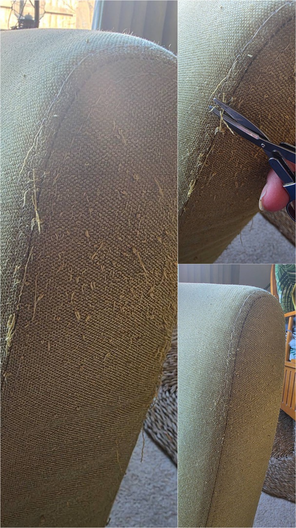 As part of the cleaning process, we carefully carried out detailed fibre trimming to reduce the impact of fraying and loose threads. This helps improve the appearance of the fabric while preventing further deterioration.